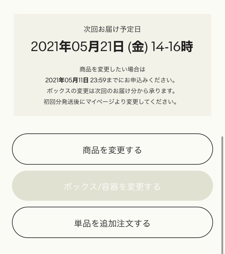 マイページの「次回お届け予定日」の下に書いてある変更締切日(上の画像の場合は「2021年5月11日」)までに解約をしないと、次のお届けが届いてしまいます。