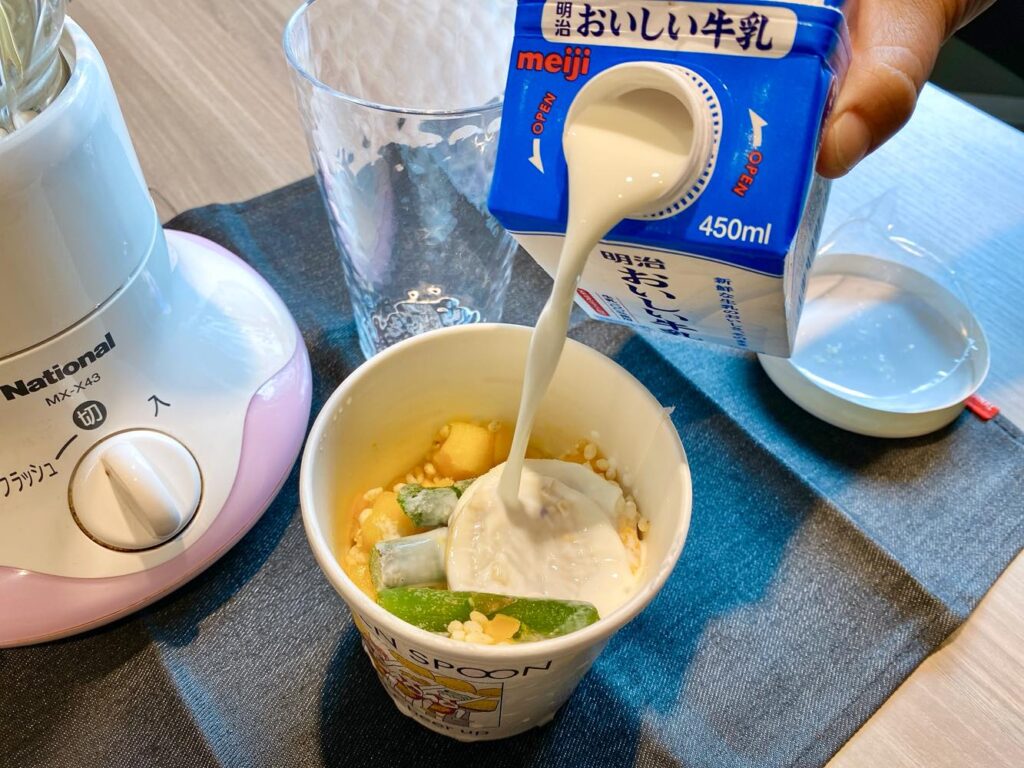 まずはカップ、もしくはパウチの中に、水・牛乳・豆乳など好きな飲み物を、食材が浸る程度入れます。