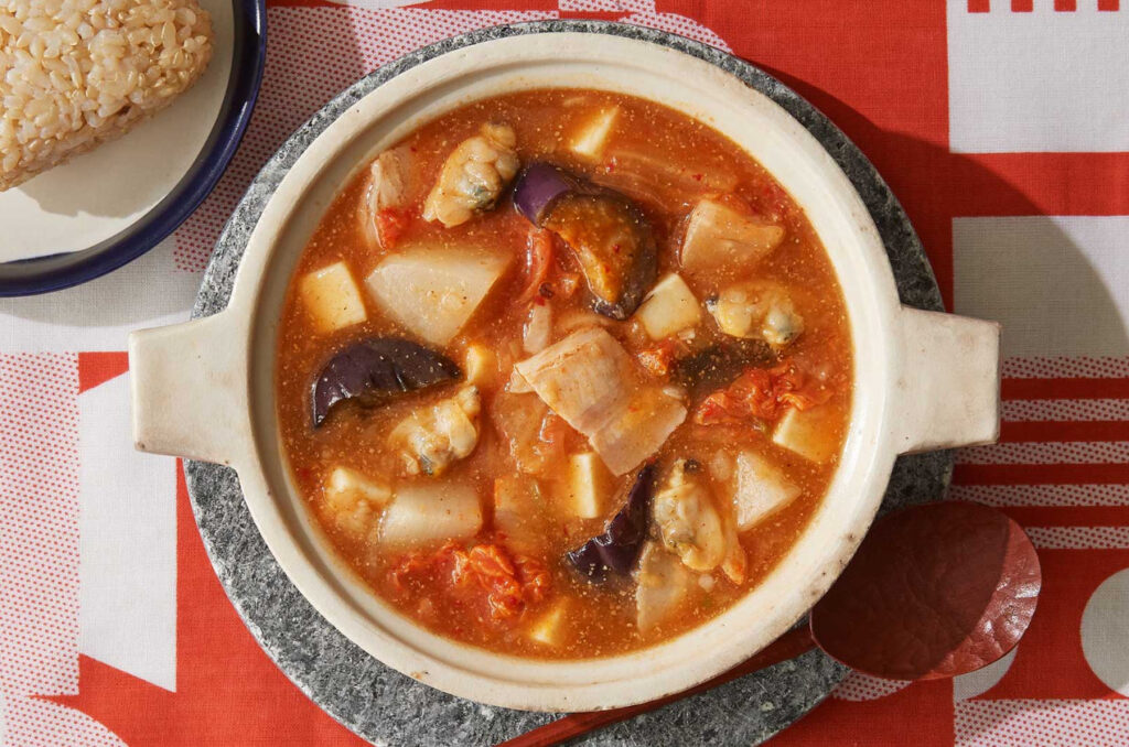 揚げなす(中国製造又はベトナム製造)、白菜キムチ、かぶ(中国)、豆腐、ねぎ、豚バラ肉、あさり、コチュジャン、もち米でん粉、白すりごま、あさりエキス、ごま油、しょうゆ、すりおろし生姜、貝柱だし、黒糖、ビーフコンソメ、あさりブイヨン、すりおろしにんにく、えのきパウダー/調味料(アミノ酸等)、豆腐用凝固剤、(一部に大豆・えび・りんご・豚肉・ごま・小麦・牛肉・ゼラチン・鶏肉を含む)