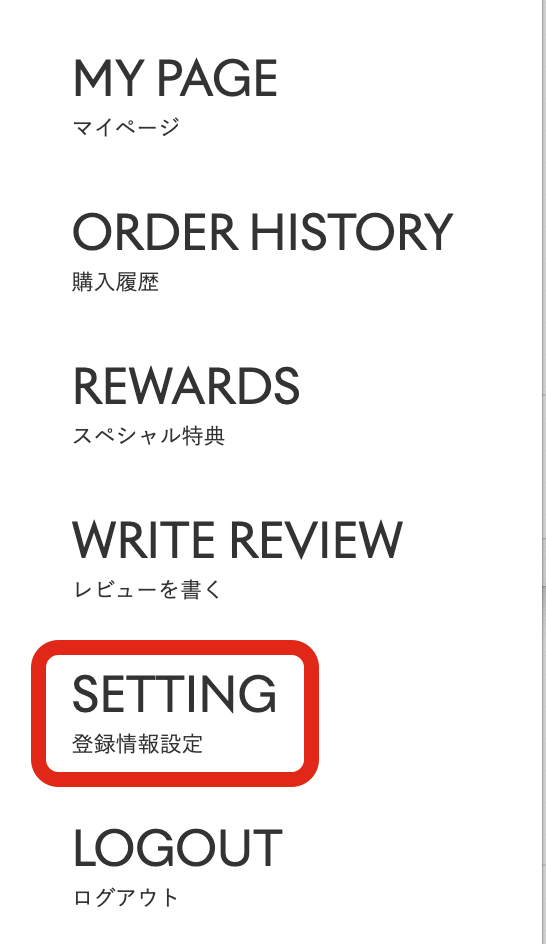 配送先住所の変更は、ログイン後にマイページの「SETTING 登録情報設定」を選ぶと変更できます。