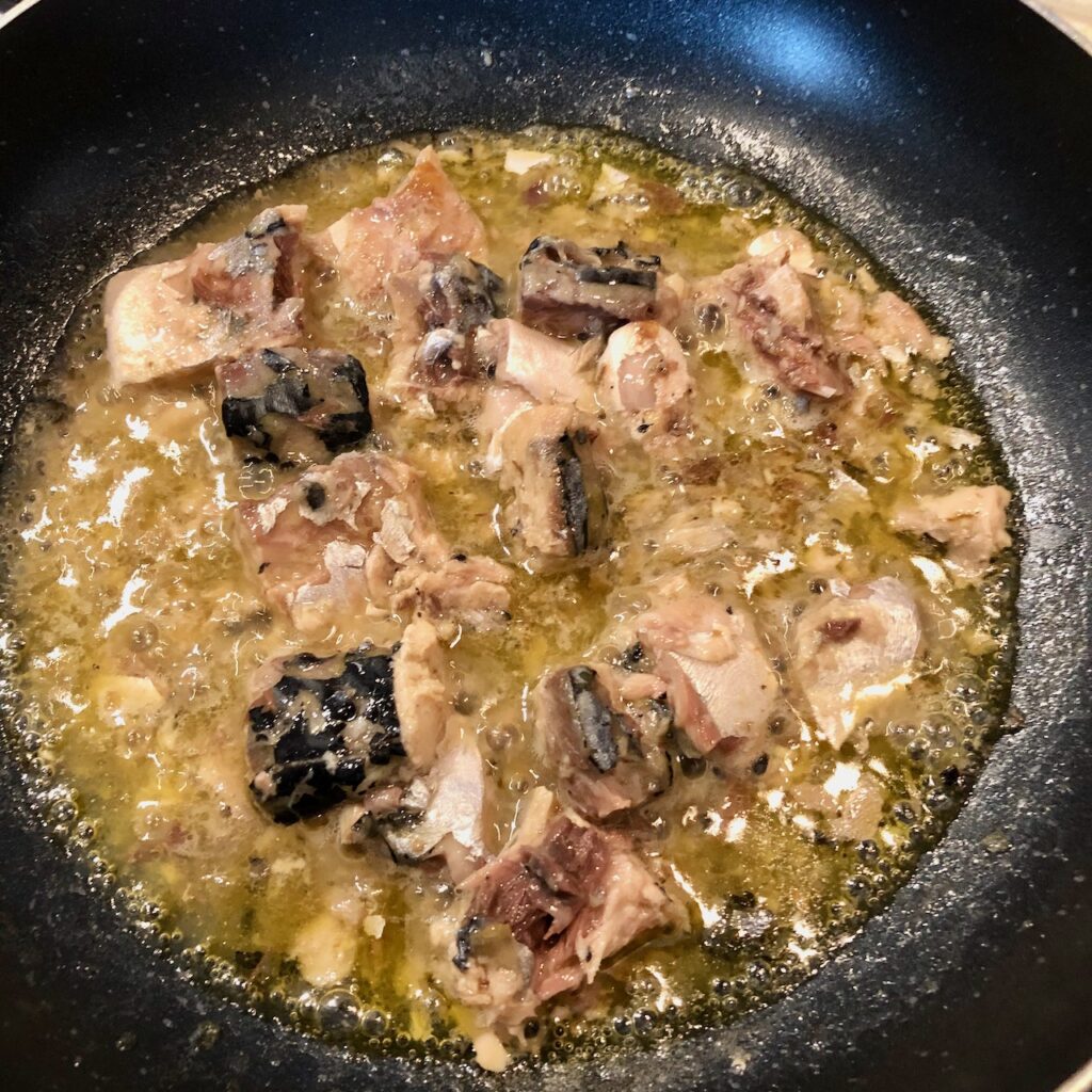 サバ缶とオリーブオイル、塩レモンソースを入れて温めたフライパンに…