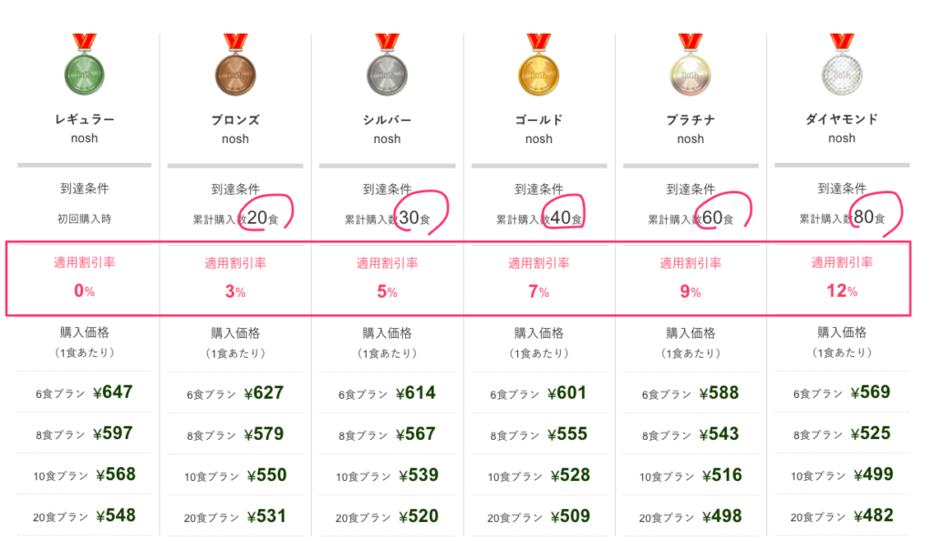 「noshランク」は、食べれば食べるほど一食あたり安くなるランク制度のこと。