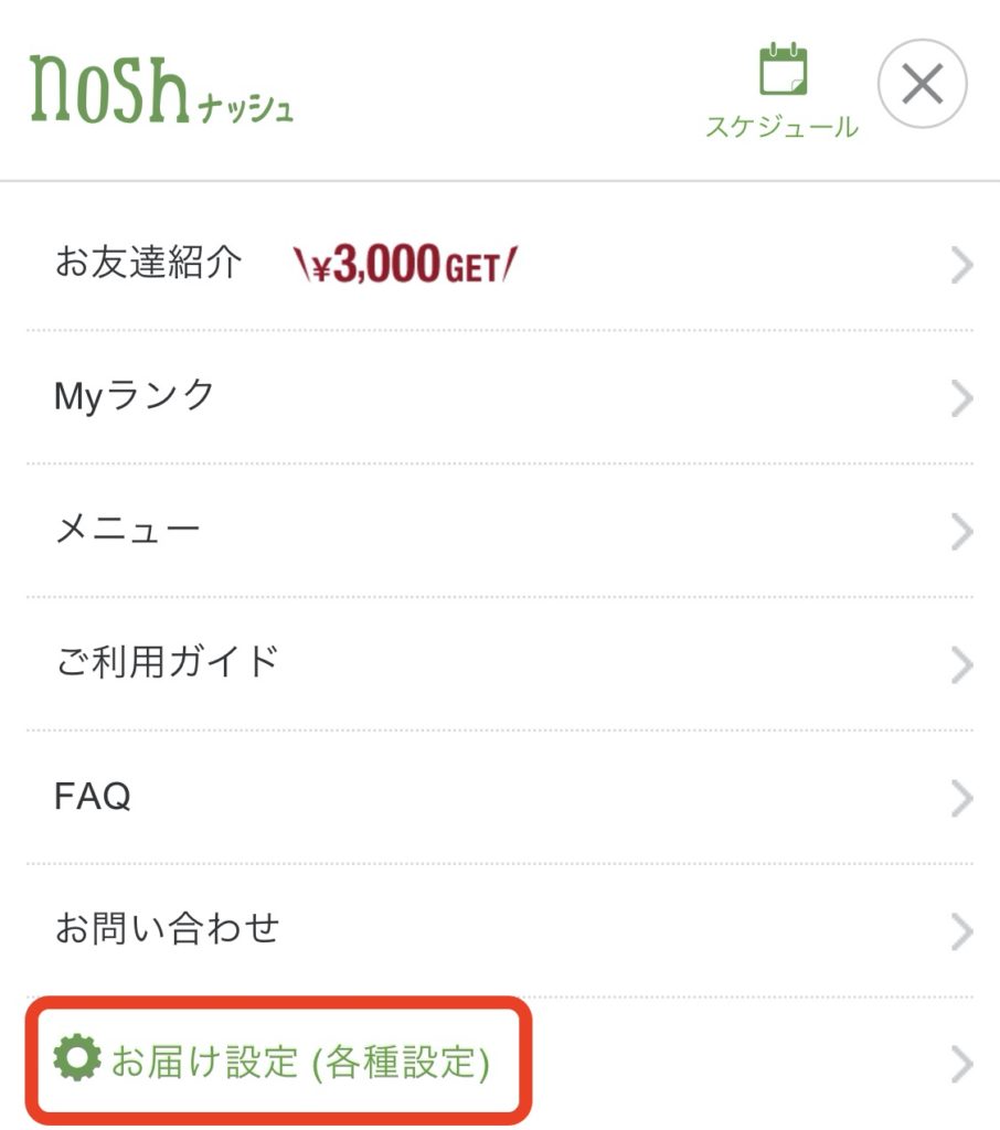 マイページから「お届け設定(各種設定)」を選びます。