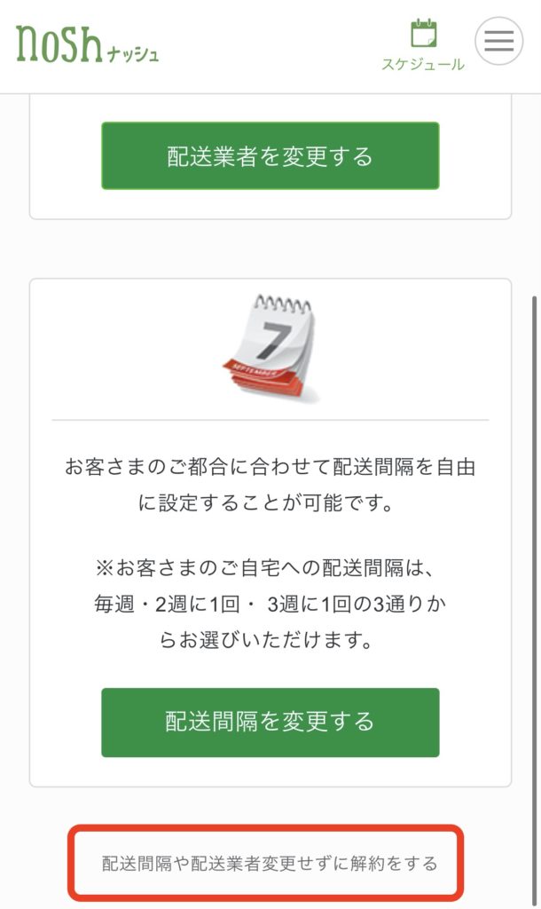 配送業者や配送間隔の変更を勧められますが、一番下に「配送間隔や配送業者変更せずに解約をする」とグレーの文字があるので、これを選びます。