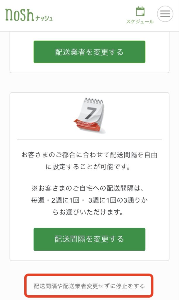 一番下のグレーの文字「配送間隔や配送業者を変更せずに停止をする」を選びます。