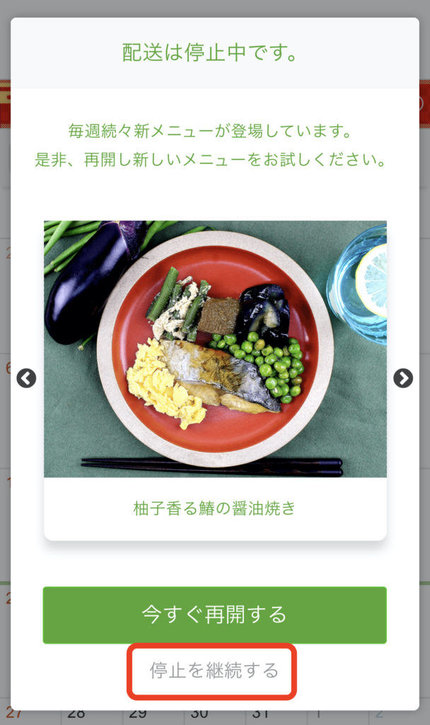 停止の受付はスキップと同じく、お届け日の4〜5日前までとなっています。