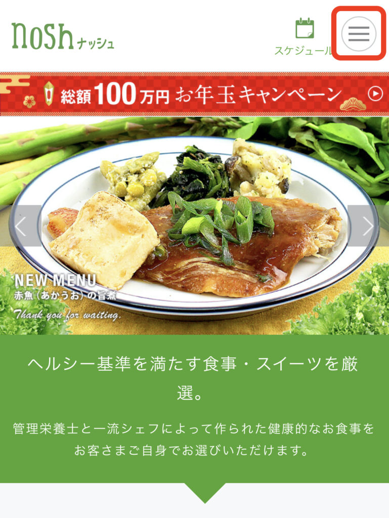 まずはマイページにログインして、右上の三本線マークをタップ。