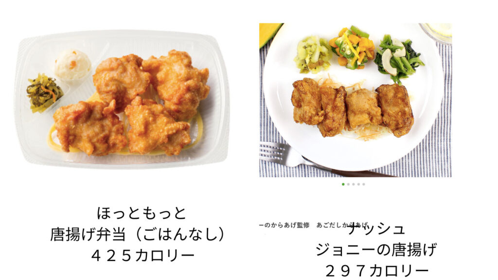 カロリー高めな唐揚げ弁当も、普通の唐揚げ弁当と比べるとナッシュのお弁当はカロリー低めです。
