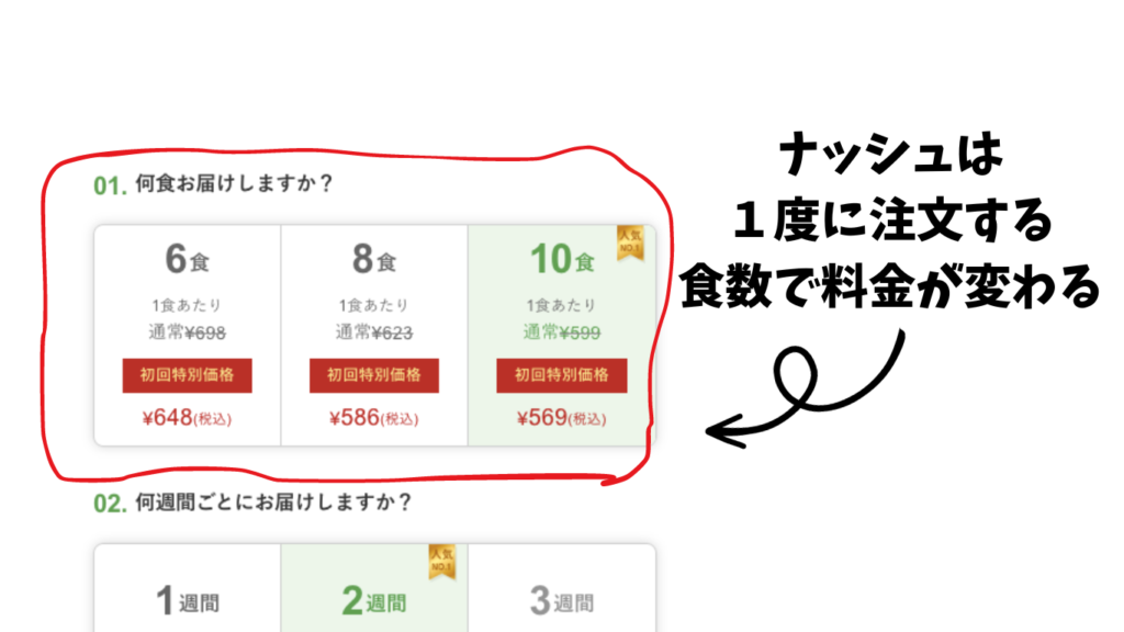 ナッシュは1度に購入する食数(個数)によって値段が変わってきます。