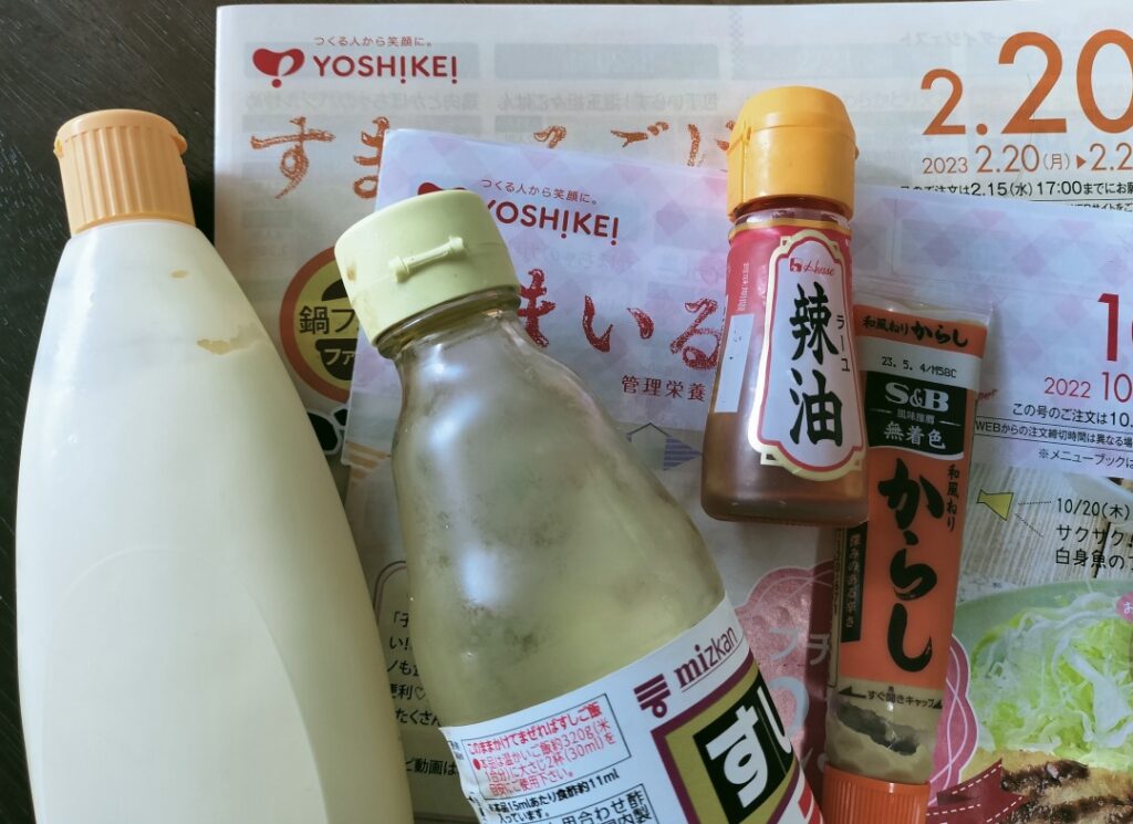 ヨシケイは、お野菜や、魚、お肉などの食材は届けられますが、調味料はついてこないんです!